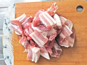![]() 1:豚肉は、8mm~1cmほどの厚めに切ります。 |
