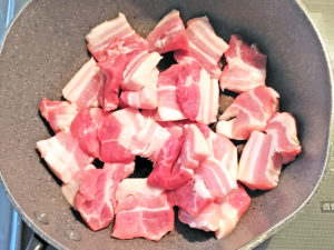 ![]() 2:テフロン加工のフライパンにごま油を引き、肉を焼き始めましょう。 |