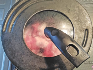 ![]() 3:肉がやや白くなったら、蓋をして、5~6分蒸し焼きにします。 ※フライパンが小さい場合は、肉の焼き加減にムラが出るので、時折混ぜて全体に火を通してください。 |