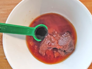 ![]() 4:小さめの器に、砂糖、みりん、味噌、オイスターソース、醤油、すりおろしたにんにくを良く混ぜ合わせて、タレを作りましょう。 |
