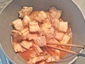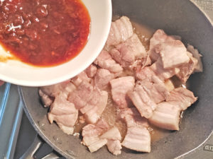 肉にはしっかりと火を通さないと危険なので、タレを入れる前に完全に白くなっているか確認してください。