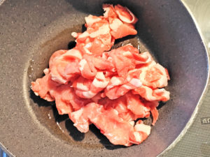 ![]() 2:フライパンにごま油をひき、豚肉を入れて、白くなるまでしっかり目に火を通します。 |