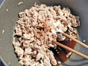 ![]() 3:フライパンに、肉用の砂糖、醤油、ほんだし、めんつゆを入れて、全体に味を絡ませましょう。 |