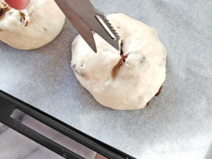 ![]() 11:生地を1つずつ手で丸め、クッキングシートを敷いた天板に乗せ、固く絞った濡れ布巾をかけて、15分置きましょう。 ※ベンチタイム |