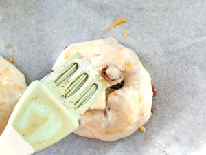 ![]() 14:生地の中央にトッピング用のバターを細かく切って乗せ、溶き卵を刷毛で1個ずつ塗ります。 |