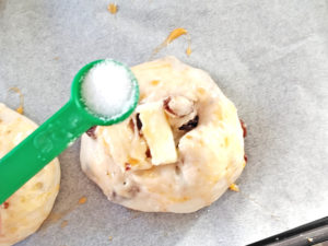 ![]() 15:仕上げにトッピング用の砂糖を、生地一個ずつにまぶせば、OK。 |