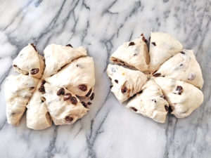 ![]() 10:スケッパーで生地をまず2等分し、さらに6等分に分けます。 |