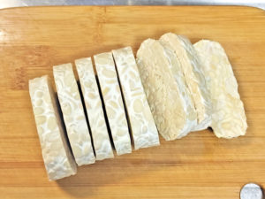 ![]() 1:テンペは解凍しておき、1~1.2cm幅に切ります。 ※今回はちょっと厚めに切りました。 |