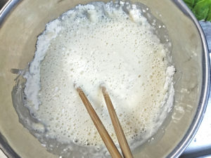 ![]() 2:ボールに、薄力粉、片栗粉、冷水を加えて、箸でざっと混ぜ合わせて、天ぷら用の衣を作りましょう。 |