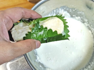 ![]() 4:青じそがくっついたら、再びテンペの全体にまとわせるようにし、揚げる寸前に衣をつけましょう。 |