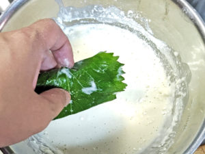 ![]() 3:まず、テンペを衣にくぐらせ、接着剤の代わりにして、青じそを1枚ずつ貼り付けます。 |