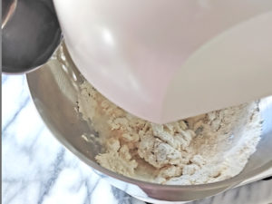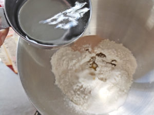 ![]() 2:スタンドミキサーにドゥーフックを装着して、水1/3量を入れて、低速で捏ねましょう。 3:捏ねている間に、水は全量入れます。 |