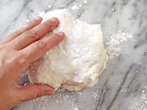 ![]() 4:台に強力粉(分量外)で打ち粉をし、生地を取り出し、生地の上にも軽く打ち粉をしたら、表面が滑らかになるまで手で捏ねましょう。 |