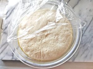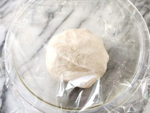 ![]() 15:丸めた生地を、天板の中に置き、ふんわりとラップをしたら、オーブンを30度に設定し、1時間二次発酵させます。 |
