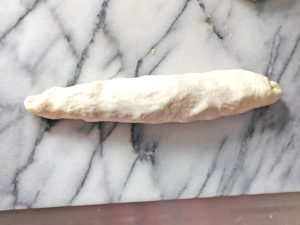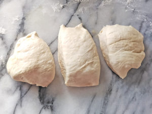 ![]() 10:生地を台に取り出し、再び打ち粉をして軽くまとめたら、スケッパーで3等分します。 |