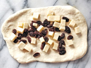 ![]() 11:1つの生地を麺棒で長方形に伸ばしたら、チーズとレーズンの1/3量を上に散らし、ロールケーキのように丸めましょう。 ※きつめに巻くのがポイントです。 |