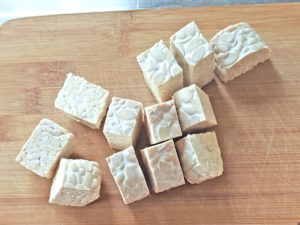 ![]() 1:テンペは解凍しておき、一口大のサイコロサイズに切ります。 |