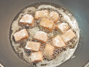 ![]() 5:180度くらいの油で、テンペの両面がきつね色(醤油の茶色)になるまで揚げ焼きします。 |