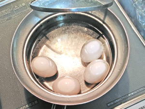 3:ゆで卵を作ったら、お湯が冷めないうちに、温泉卵用の卵を入れ、15分ほど放置します。