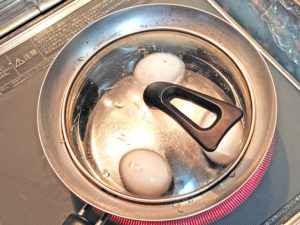 1:鍋に水と卵を入れて火にかけ、沸騰したら10~12分ゆでてゆで卵を作ります。