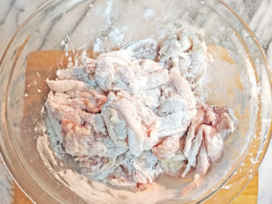5:鶏肉と片栗粉をボールに入れ、鶏肉全体に粉をまぶします。