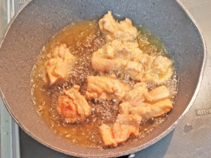 6:180度くらいの油で、鶏肉の両面がきつね色になるまで揚げましょう。