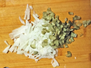 7:タルタルの玉ねぎは皮をむいてみじん切りに、ピクルスもみじん切りにします。
