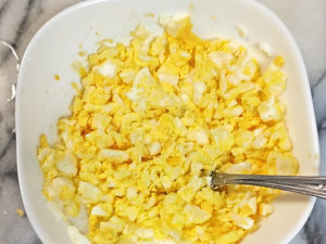 8:容器にゆで卵を入れ、フォークでつぶしましょう。