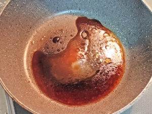 10:フライパンに、丼用の砂糖、醤油、みりんを入れ、軽く火を入れて調味料を溶かしましょう。