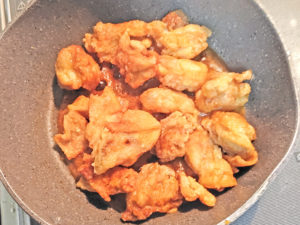 11:調味料が溶けたら、唐揚げを入れて、全体に味を絡めたらOK。