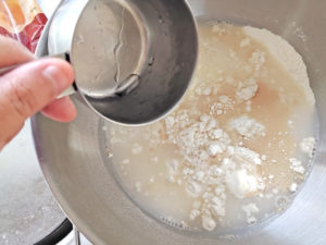1:スタンドミキサーのボールに、強力粉、グラニュー糖、塩、スキムミルク、ドライイースト(塩の反対側に)、水を加えて、ドゥーフックを付けて、一番低速で混ぜます。