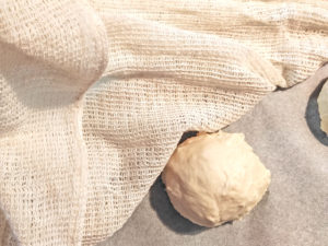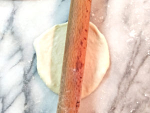 12:生地の中央にクリーム玉を乗せ、周囲の生地を寄せ集めるようにして、クリーム玉を包みましょう。