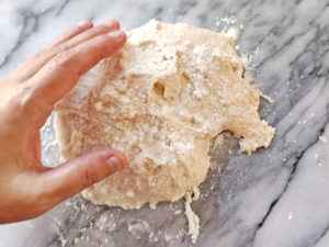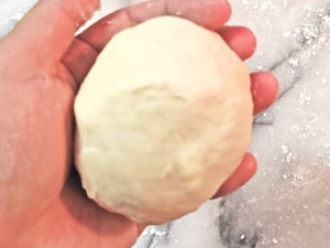 3:台の上に薄く強力粉(分量外)を振り、生地を取り出して、表面が滑らかになるように軽く捏ねて、丸めたら、違うボールに入れましょう。