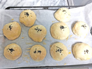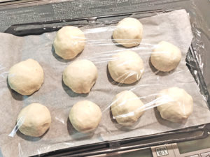 13:丸めた生地を、クッキングシートを敷いた天板の上に乗せ、30度のオーブンで20分ほど置いて、2次発酵をさせたら、天板を取り出します。