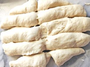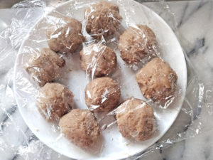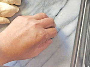 9:一つずつ生地を手に取り、手をかごのようにしてクルクルと丸め、台の上に出します。