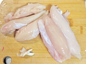 ![]() 1:ささみは、筋の部分を片手で引っ張りながら、包丁を当てて滑らすようにし、筋を取っておきます。 |