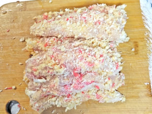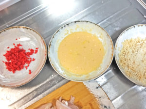 ![]() 3:ささみを、紅生姜→卵液→パン粉の順に衣をつけます。 |