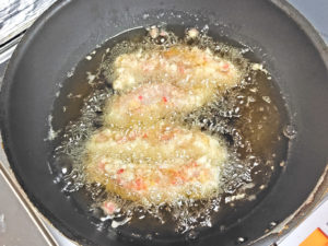 ![]() 4:190度の油で、片面3分ずつ揚げましょう。 ※目安なので、表面がきつね色になるまで揚げればOKです。 |