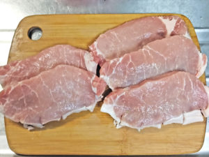 1:豚肉は、身と脂身の間に垂直に切り込みを入れます。