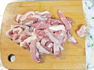 ![]() 2:豚バラ肉は、少し太めのスティック状に切りましょう。 ※先に1cm幅ほどに切り、その後スティックに切ると楽です。 |