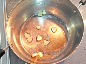 ![]() 3:鍋にごま油をひき、スライスしたにんにくを加えて、弱火で炒めて香りを出します。 |