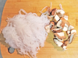 ![]() 4:椎茸は石突をとって小さめに切り、白滝は水気を切って3棟分の長さに切りましょう。 |