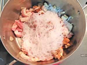 ![]() 5:鍋に豚肉、椎茸、白滝を入れ、肉の色が白くなるまで炒めます。 |