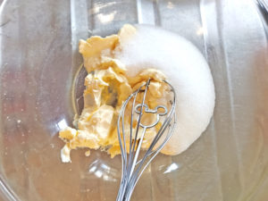 ![]() 1:耐熱ボールにマーガリンを入れて、レンジで20秒ほど加熱し、クリーム状にします。 2:上白糖を加え、ザラザラ感がなくなり、白っぽくふわふわするまでしっかりと混ぜ合わせましょう。 |