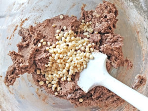 ![]() 6:ボールにチョコチップも加えて混ぜ、チップが全体に散ったらOK。 |