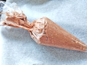 ![]() 7:生地に粉っぽさが無くなったら、絞り袋に詰め、袋の先を少し切って口金代わりにします。 |