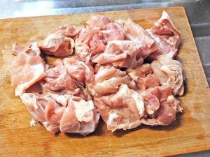 ![]() 1:鶏肉は1枚を6等分し、大きめに切ります。 |