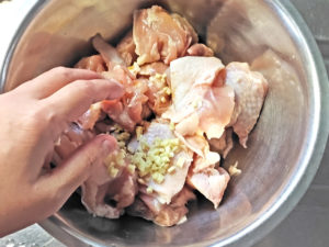 ![]() 2:ボールに鶏肉とみりん、めんつゆ、生姜のみじん切りを加えて手で良くもみこみましょう。 3:そのまま室温で15分ほど置きます。 |