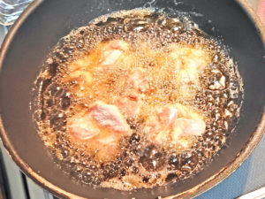 ![]() 5:180度くらいの中温の油で揚げ始めます。 |