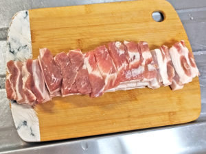 ![]() 1:豚肉は、1.5cm幅くらいの少し厚めに切ります。 |